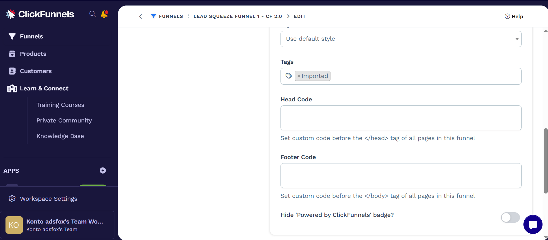 Po dodaniu skryptu i zapisaniu zmian Twój funnel w ClickFunnels jest poprawnie połączony z adsfox.