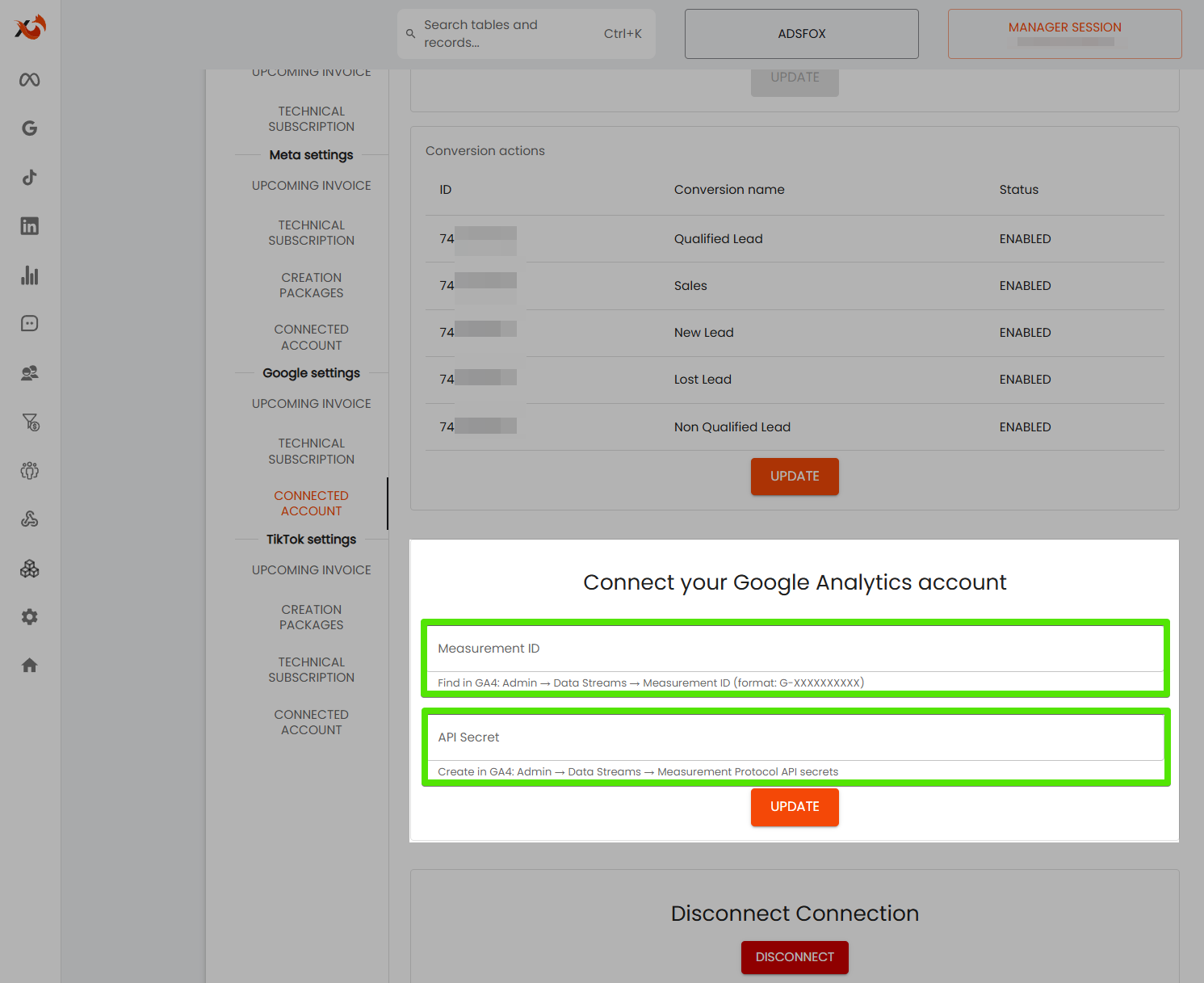 - Wróć do zakładki Ustawienia Google (Połączone konto) w adsfox i wklej Measurement ID w odpowiednie pole.