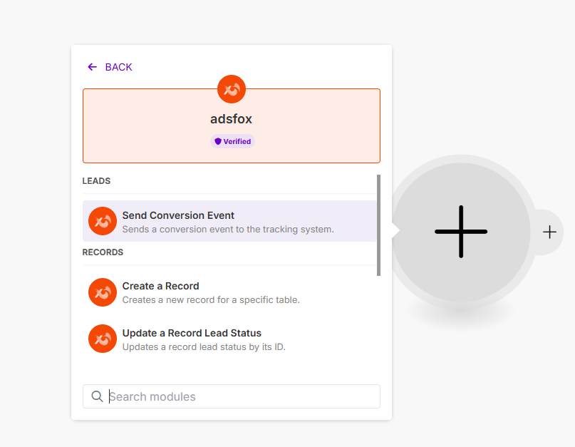 - Akcja (Send Conversion Event) – Make wysyła te dane do adsfox poprzez moduł adsfox → Send Conversion Event.