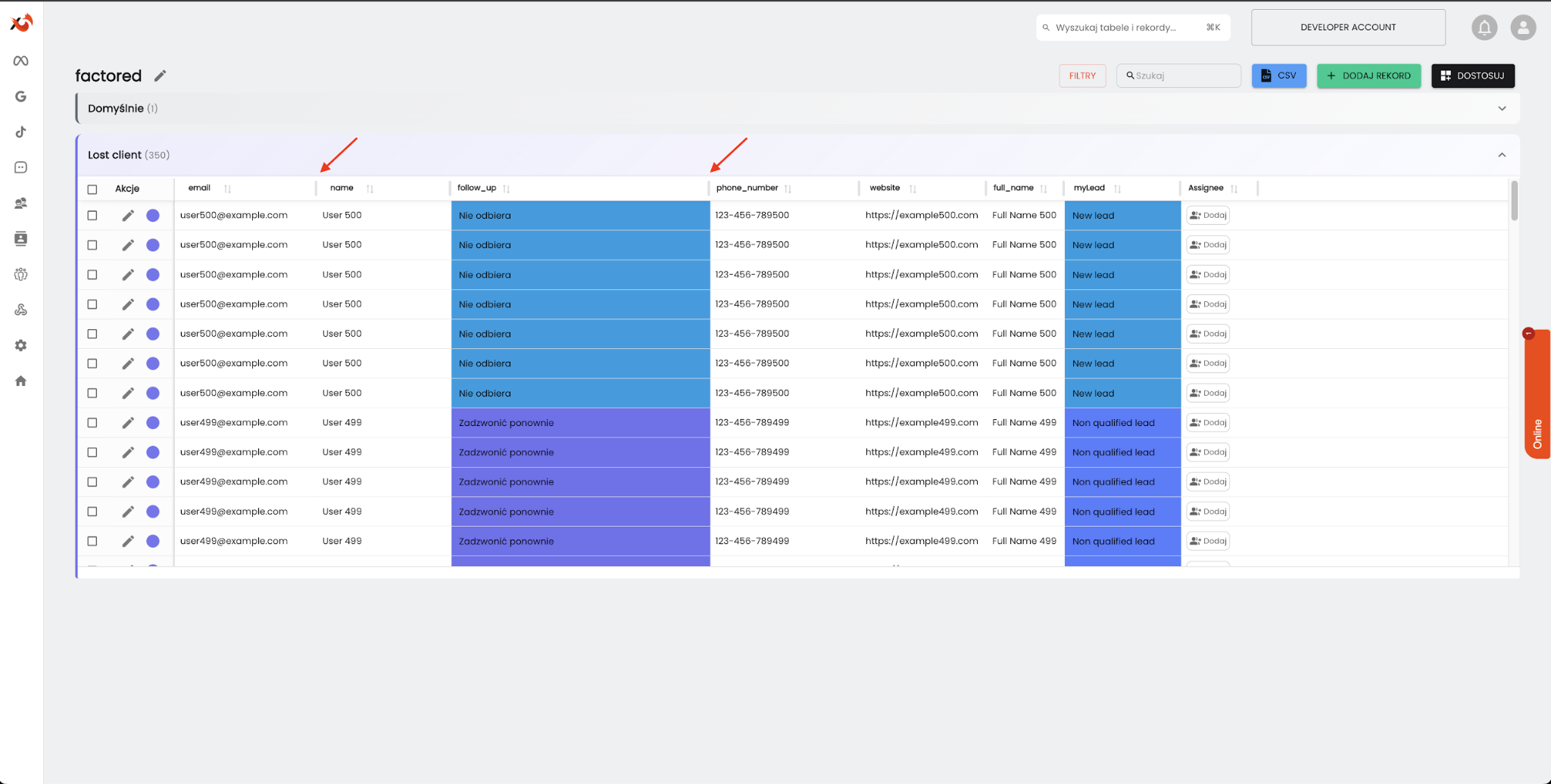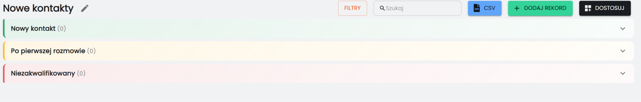 Jeśli korzystasz z integracji CRM, np. z formularzami na stronie czy z Meta Ads, najpierw musisz przesłać pierwszy rekord. To właśnie on tworzy odpowiednie kolumny na podstawie danych zbieranych przez formularz. Dopiero po tym kroku możesz swobodnie rozwijać tabelę, dodając własne kolumny i pola.