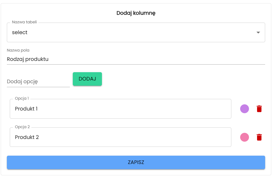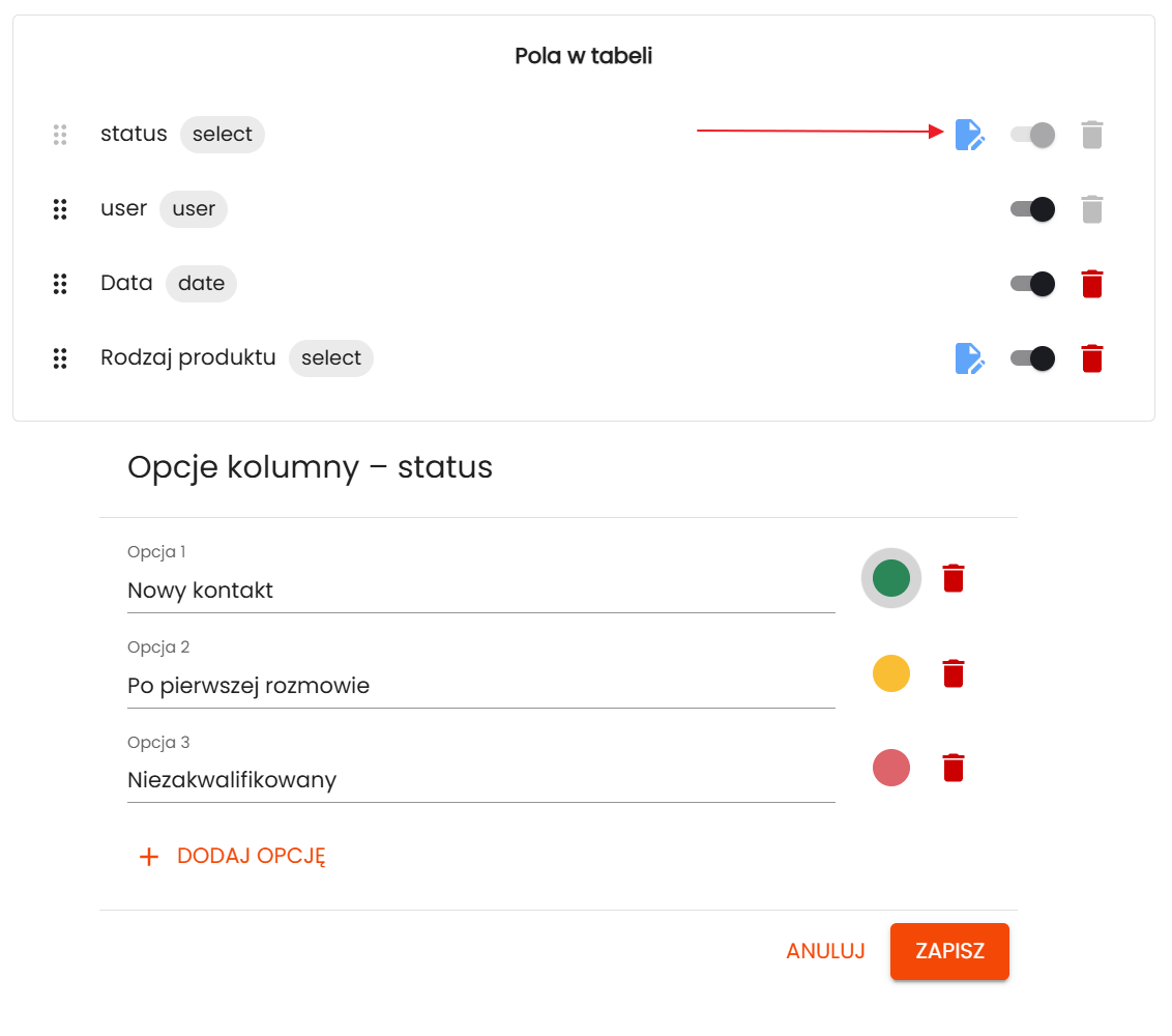 Pola Select (listy rozwijane) – umożliwiają tworzenie gotowych opcji do wyboru, np. statusów kontaktu: „po rozmowie telefonicznej”, „nie odbiera”, „sprzedaż zakończona”. Dodatkowo istnieje możliwość przypisania kolorów do poszczególnych opcji, co ułatwia orientację i zwiększa czytelność danych.