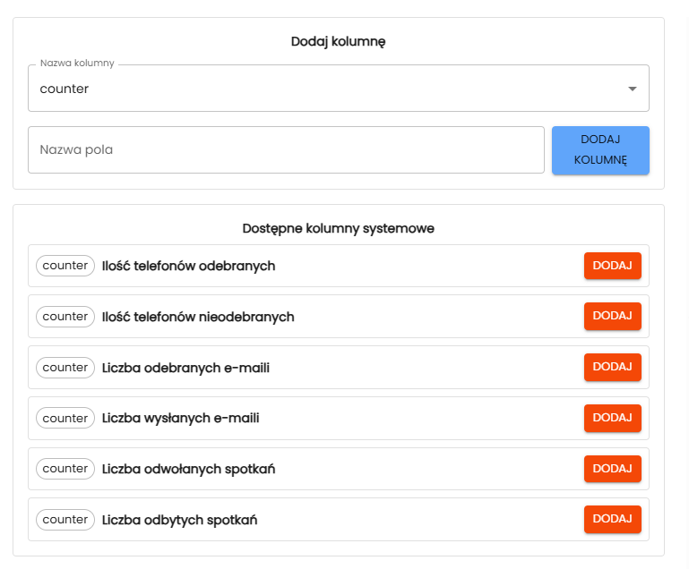 - Pola cuounter – umożliwiają proste mierzenie danych, takich jak: liczba odebranych telefonów, liczba otrzymanych e-maili, liczba wysłanych e-maili, liczba odbytych spotkań czy liczba odwołanych spotkań. Obecnie wartości w tych polach należy wprowadzać ręcznie. Docelowo planowane są automatyzacje, które pozwolą na automatyczne przypisywanie tych danych.