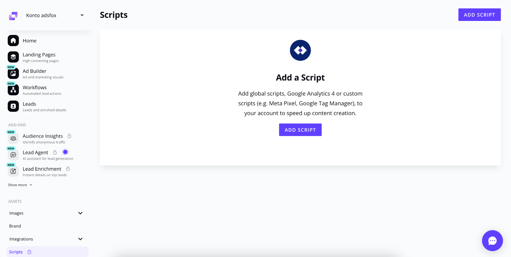 Dedykowany skrypt z adsfox znajdziesz w swoim panelu adsfox w zakładce Lead acquisting a następnie website script: