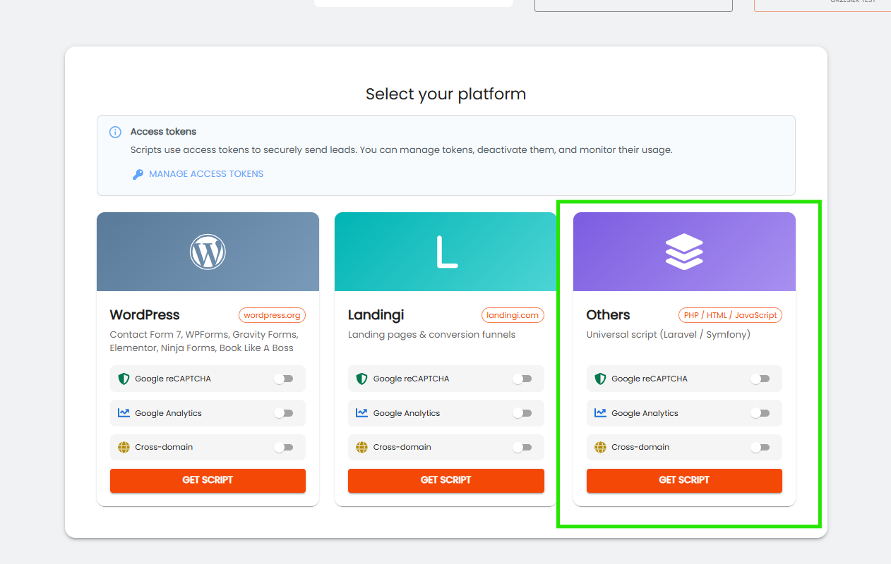 Następnie z listy wybierz platformę za pomocą której moderujesz swoją stronę internetową. W przypadku Unbounce będzie to “inne”. Jeżeli na swojej stronie korzystasz z reCAPTCHA, GA4 zaznacz te opcję przed pobraniem skryptu.