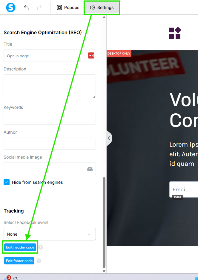 Po wklejeniu skryptu w sekcji Edit header code oraz zapisaniu zmian, Twoja strona w Systeme.io jest w pełni połączona z adsfox.