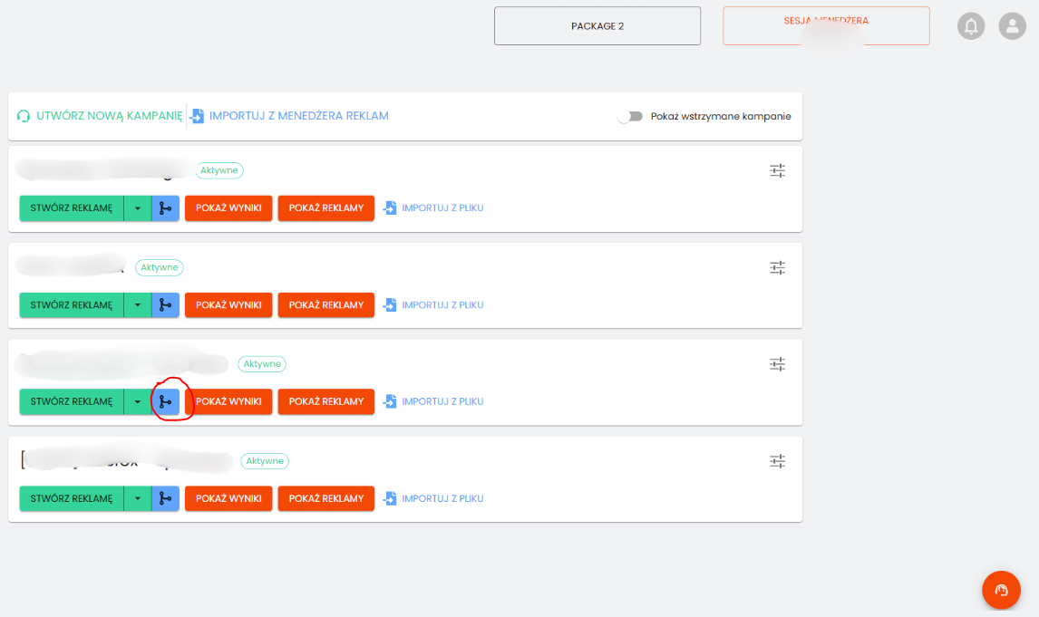 - Przejdź do kampanii, w której ma zostać umieszczona reklama, a następnie kliknij przycisk widoczny na ekranie.