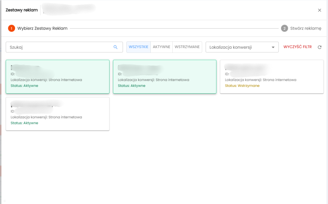 2. Następnie zaznacz zestawy reklamowe do których chcesz dodać kreacje.