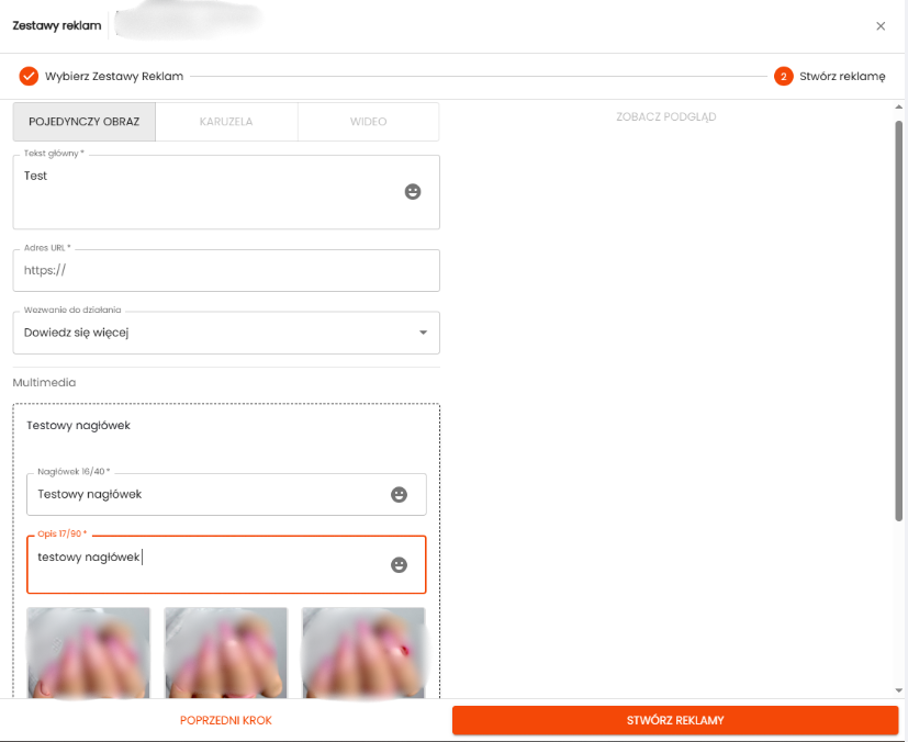 3. Po przejściu do kolejnego etapu należy uzupełnić wszystkie wymagane pola, które będą widoczne dla odbiorców reklamy, a następnie kliknąć przycisk „Stwórz reklamy”.