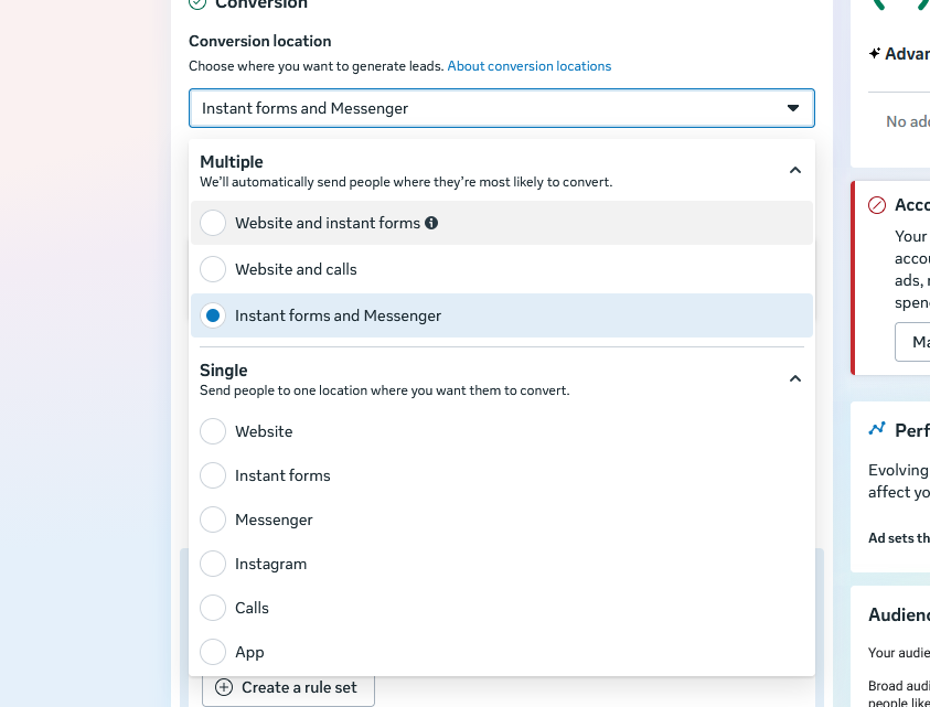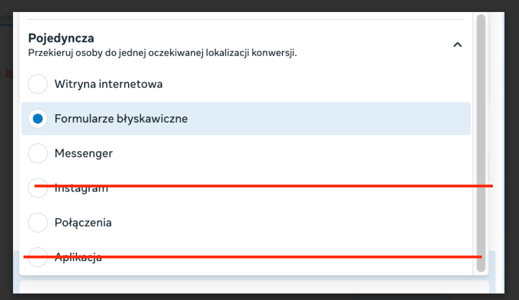Podczas tworzenia kampanii należy pamiętać, że system adsfox obsługuje wyłącznie kampanie z jedną lokalizacją konwersji. Oznacza to, że w sekcji Conversion location należy zawsze wybrać opcję z grupy Single – np. Website albo Instant forms.