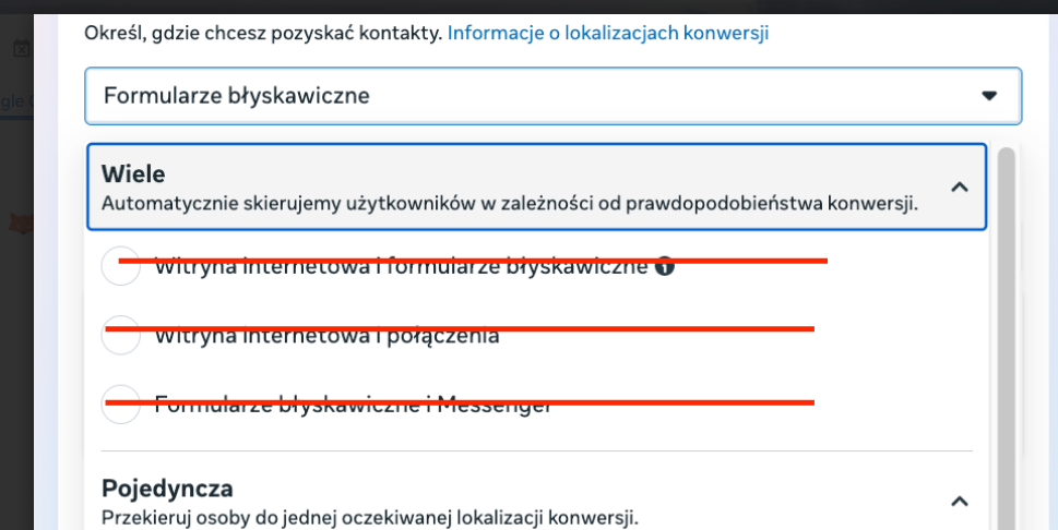 Nie są obsługiwane kampanie, w których włączono tryb Multiple (np. „Instant forms and Messenger” lub „Website and calls”), ponieważ prowadzi to do błędnej interpretacji danych i utrudnia integrację z CRM.