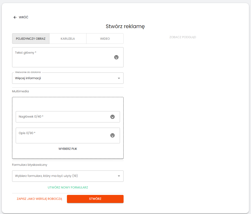 Po kliknięciu przycisku wyświetli się formularz do tworzenia reklamy: