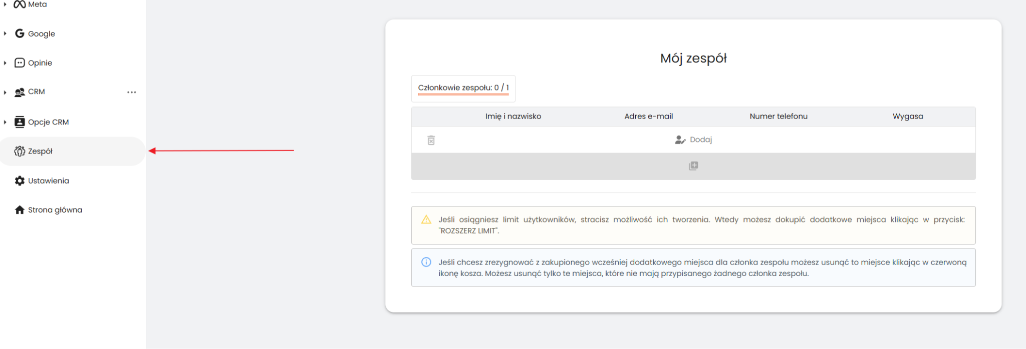 Funkcja zarządzania zespołem znajduje się w panelu nawigacyjnym po lewej stronie, pod ikoną przedstawiającą trzy osoby. Kliknij zakładkę „Zespół”, aby przejść do ustawień dotyczących dodawania użytkowników oraz nadawania im odpowiednich ról i uprawnień.