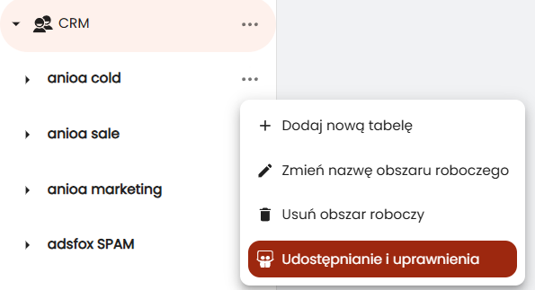 W module CRM, w sekcji „Udostępnianie i uprawnienia”, można przypisać poszczególnym członkom zespołu dostęp do wybranych tabel lub całych przestrzeni roboczych. Dzięki temu każdy pracownik ma wgląd jedynie w te dane, które są mu niezbędne do wykonywania obowiązków.