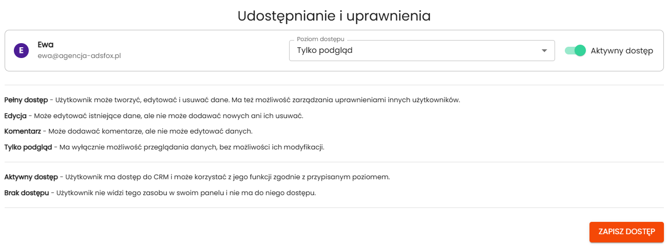 Podczas dodawania nowego użytkownika można precyzyjnie określić zakres jego uprawnień w systemie CRM. Przykładowo, użytkownik może mieć dostęp:
